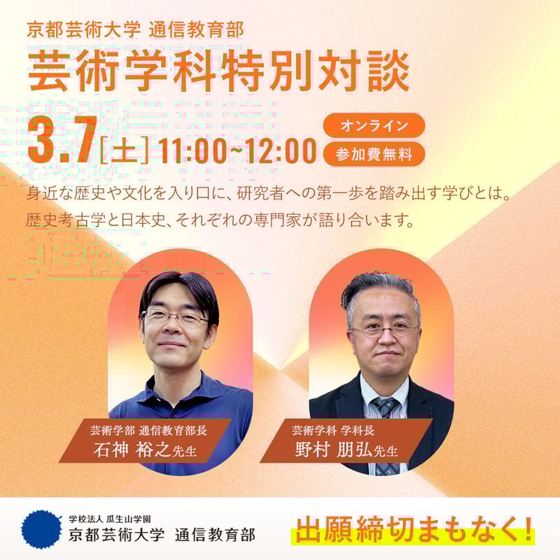 石神裕之先生(通信教育部長)×野村明弘先生(芸術学科長)による、特別対談イベントを開催します!