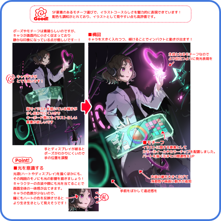 入学前は「女の子を描く」「このモチーフを入れたい」など描きたいものを感覚的に描いていた部分がありました。しかし、理解してからは人物やモチーフが何を伝えようとしているのか、どんな意味や役割を持っているのかなど、描くもの一つ一つに対して意味を考えるようになりました。